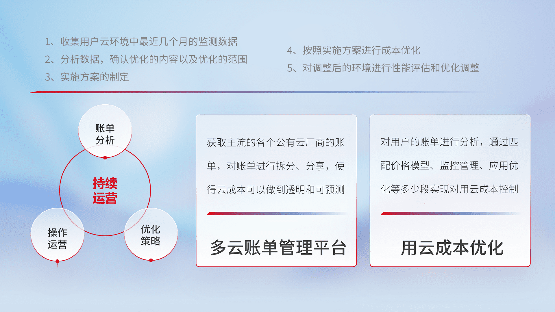 通过多云纳管,,,,以统一的资源数据模型把客户的云资源进行抽象和封装,,,进而实现对多云资源的统一操作,,,,保障云资源管理的可靠性、、、稳定性与可用性。。。。量身定制化运维内容,,配置、、开发运维、、、补丁管理、、、、备份、、、监控、、认证和访问管理、、审计和日常巡检等,,,,保障在用云过程中的可靠度,,,稳定度以及高可用率。。。